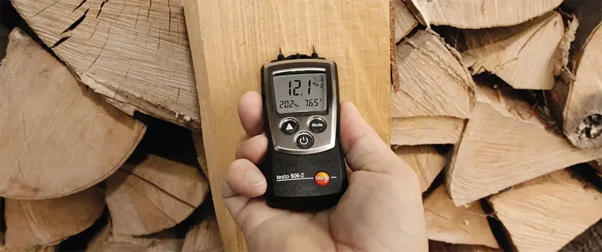 Как проверить влажность дров без прибора? Ударьте поленом о полено. Сухие дрова при ударе издают звонкий, «пустой» звук. Сырые — глухой и тяжелый. Можно еще посмотреть на торец. Сеть мелких трещин — верный признак достаточной сухости. Но лучше воспользоваться влагомером. Устройство недорогое, но полезное. Прослужит не один сезон.