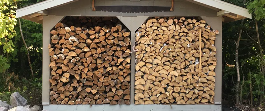 - Вентилируемое основание: нижний ряд кладите на лаги (брусья) или поддоны. Дрова не должны лежать на земле — иначе впитают влагу.